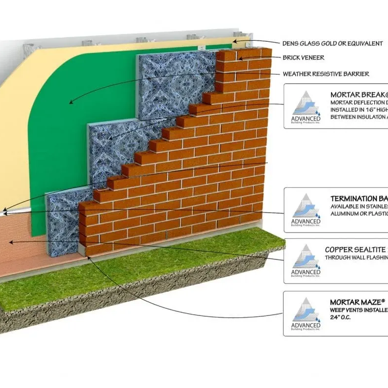 Mortar Break® is designed to prevent mortar droppings from blocking and clogging head joint drainage channels at all flashing locations for masonry cavity wall applications. Mortar Break® suspends excess mortar droppings above the weep holes and allows moisture within the cavity to drain down the flashing and out of the wall. The system also helps to maintain an airspace for ventilation and drying of the wall cavity.
